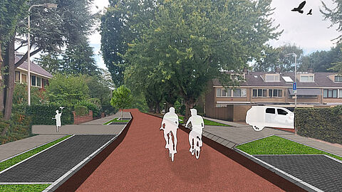 Door de inrichting van een fietsstraat wordt het minder aantrekkelijk om met hoge snelheid te rijden. Er komen verkeersremmende maatregelen om de snelheid te verminderen. Het weggedeelte proberen we ook visueel te versmallen door de parkeerplaatsen verhoogd aan te leggen (op gelijk niveau als de stoep).